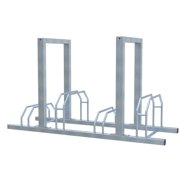 4er Modul für Fahrrad-Reihenanlage 1400 mm mit Hohen und Tiefen Bügel beidseitig benutzbar mit zusätzlichen 2x Hohen Anlehnbügel Radabstand 350mm, Reifenbreite bis 55mm Breite: 500 mm, Höhe: 800 mm feuerverzinkt, inkl. Lamellenstopfen