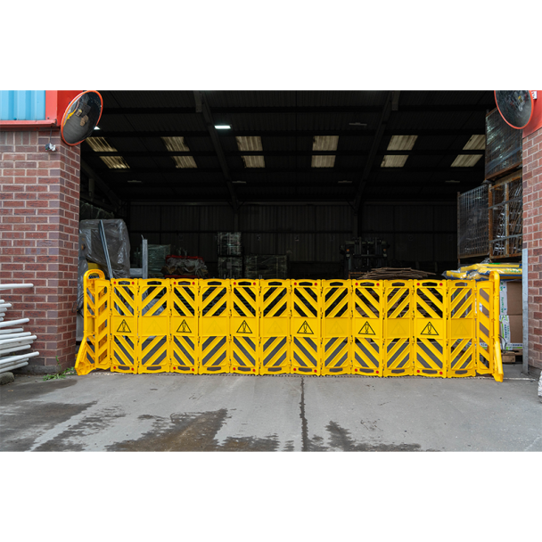 Diese Barriere ist leicht zu transportieren und kann platzsparend gelagert werden. Im ausgeklappten Zustand misst sie beeindruckende 3900 mm x 1000 mm und bildet so eine sichtbare und langlebige Absperrung für jede Situation.