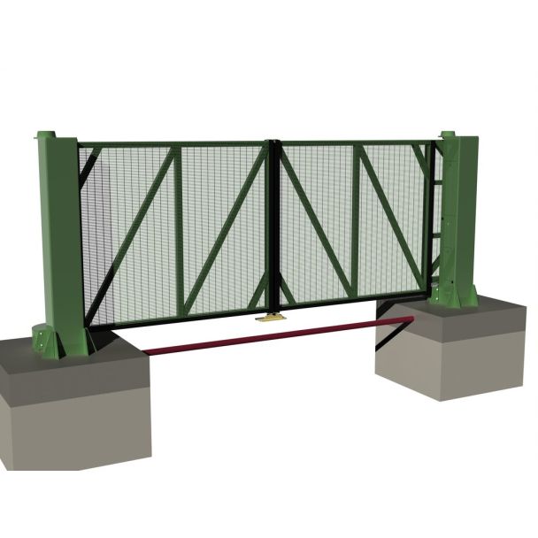 Diese automatischen Schwenktore sind aus verzinktem Stahl gefertigt und in Ein- oder Zweiflügelvarianten erhältlich. Sie öffnen und schließen sich schnell, sicher und werden über ein Feig-Bedienfeld gesteuert. Dieses Bedienfeld ermöglicht eine automatische und intelligente Steuerung des Tors, sodass es sich je nach Programmierung oder durch den Einsatz eines Geräts wie einem Schlüsselanhänger öffnen kann. Das Feig-Bedienfeld steuert die Tore, indem es in die Stromquelle eingebaut wird, die dann ein Relaissignal an die Tormotoren sendet und diese anweist, sich auf Befehl zu öffnen und zu schließen. Das Bedienfeld kann auch andere Funktionen steuern, wie die Tageszeit, zu der sich die Tore öffnen, die Geschwindigkeit und das Personal, das Zugang zum Tor hat (über Kontrollzugangsgeräte wie Schlüsselanhänger).