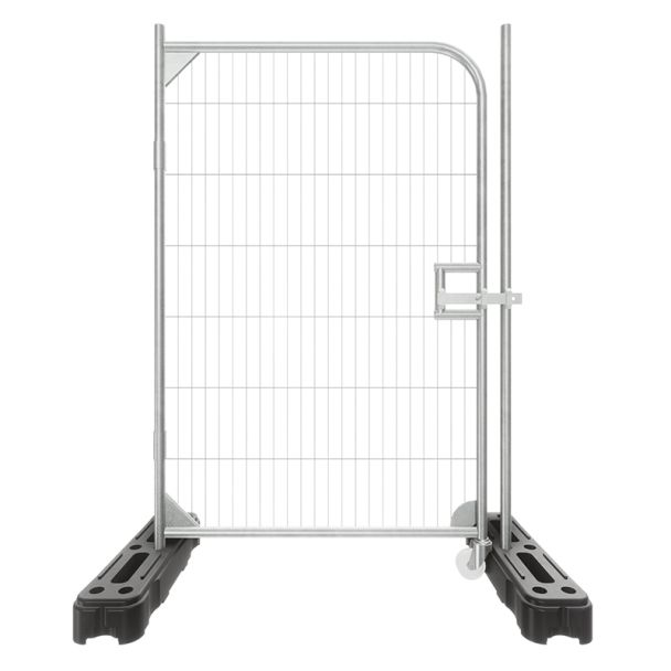 Freistehende Sicherheitstore aus Gitter sitzen in Gummiblock-Zaunfüßen und können mit Kupplungen (Zaunklemmen) direkt an Ihr temporäres Zaunsystem angeschlossen werden. Sie sind eine perfekte Möglichkeit, den Zugang zu Ihrem Gelände sicher und effektiv zu verwalten.