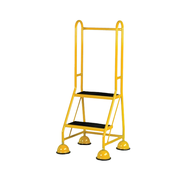 Die Standbeine jeder Treppe sind mit gewölbten, gefederten Lenkrollen ausgestattet, die das Manövrieren erleichtern und im Stand für erhöhte Stabilität sorgen. Jede Treppe verfügt über eine doppelt gerollte Unterkante und einen Schutzstreifen, und alle Rollen sind mit grauen, nicht abfärbenden Reifen ausgestattet.