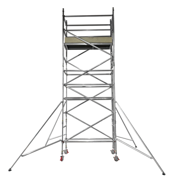Die Konstruktion besteht aus hochfesten Aluminiumrohren und ist in verschiedenen Aufbauhöhen verfügbar. Mit einer maximalen Belastbarkeit von 275 kg pro Plattform eignet sich der Gerüstturm auch für anspruchsvolle Arbeiten mit Werkzeug und Material.