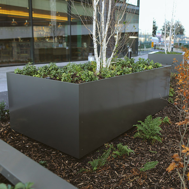 Dieser große Pflanzkübel aus Stahl mit großem Fassungsvermögen bietet Platz für Büsche, Hecken und andere Sträucher in einem modernen, elegant gestalteten Pflanzkübel. Dieser Pflanzkübel aus Weichstahl mit verzinkter Oberfläche wird häufig als dezente natürliche Ergänzung moderner Räume in Städten und Ortschaften verwendet. Der Pflanzkübel ist für zusätzliche Haltbarkeit pulverbeschichtet und verfügt über einen oberen Rahmenschlupf und eine Schattenfuge an der Basis.