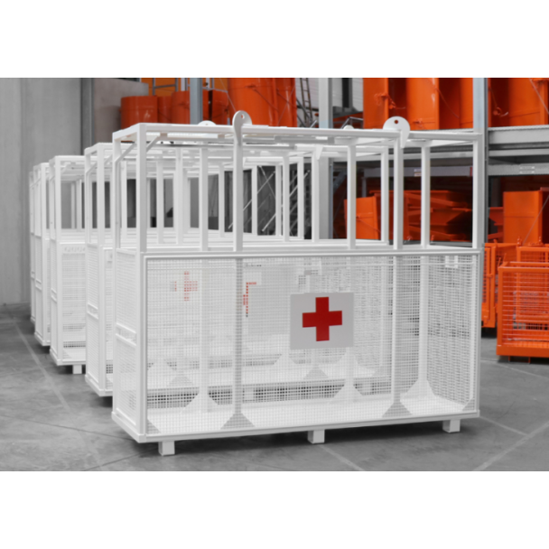 Die Türen an den Schmalseiten des vollständig geschlossenen Korbes ermöglichen dem Ersthelfer das Ein- und Aussteigen mit der Trage an der jeweils offenen Seite; ausgestattet mit einer gefederten Basis, 1,40 m Seil und gefederten Füßen zur Stoßdämpfung beim Absetzen. Der Rettungskorb wird als Kranevakuierungskorb geliefert und kann verwendet werden, wenn ein Verletzter aus großer Höhe evakuiert werden muss. Er ist für 2 Personen (1 Verletzter und 1 Pfleger) geeignet und wird in Weiß mit der entsprechenden Beschilderung geliefert. Jede Einheit wird komplett mit einer viersträngigen Kettenschlinge geliefert, die mit Verbindungsstücken an den Haupthebepunkten befestigt ist.