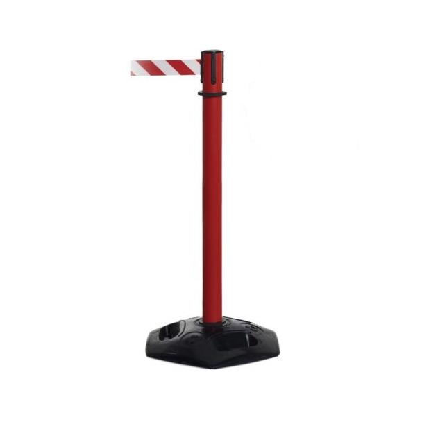 Robuster Absperrpfosten mit schwarzer Gummibasis, ideal für Innen- und Außenbereiche. Der Pfosten aus Kunststoff und die solide Basis mit Tragegriffen sind stapelbar für eine einfache Lagerung. Das Gurtband hat eine Länge von 3,65 m und ist in Rot oder Gelb verfügbar.
