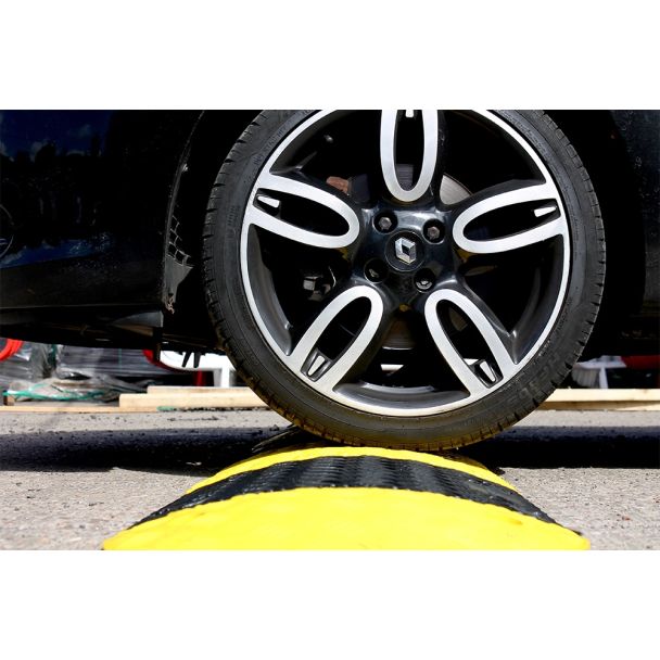 Die 50 mm hohen Verkehrsbremsschwellen sind für eine maximale Geschwindigkeit von 16 km/h konzipiert und kommen in 500 mm langen schwarz-gelben Segmenten mit 210 mm langen Endkappen. Diese Segmente ermöglichen es, die Bremsschwelle auf die gewünschte Länge anzupassen und sie einfach mit M10-Schrauben (nicht im Lieferumfang enthalten) durch die vorgesehenen Löcher zu befestigen. Ausgestattet mit weißen Katzenaugen, sind die Bremsschwellen auch nachts gut sichtbar.